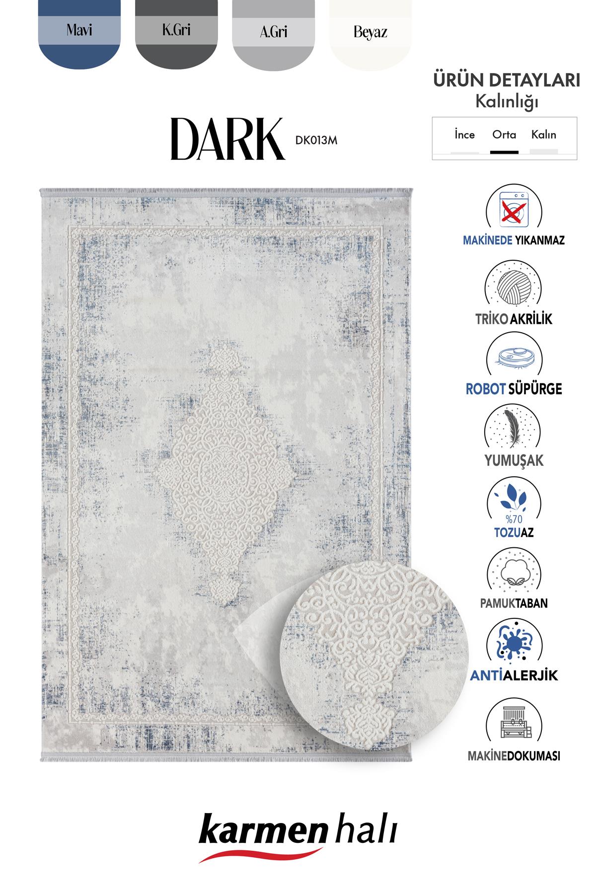 Karmen Halı Dark Dk013m, gri ve mavi tonlarının eskitme detaylarıyla birleştiği, zarif göbekli tasarımıyla dikkat çeken modern bir halıdır. Triko akrilik ve pamuk karışımı ile dayanıklılığı ve konforu bir arada sunar. 9 mm hav yüksekliği ile yumuşak bir dokunuş sağlayan bu halı, kaymaz tabanı sayesinde güvenli bir kullanım sunar. 2400 gr/m² ağırlığı ile kaliteli bir yapıya sahip olan bu halı, toz yapmayan özellikleriyle temizliği kolaylaştırır ve uzun ömürlü kullanım sağlar.