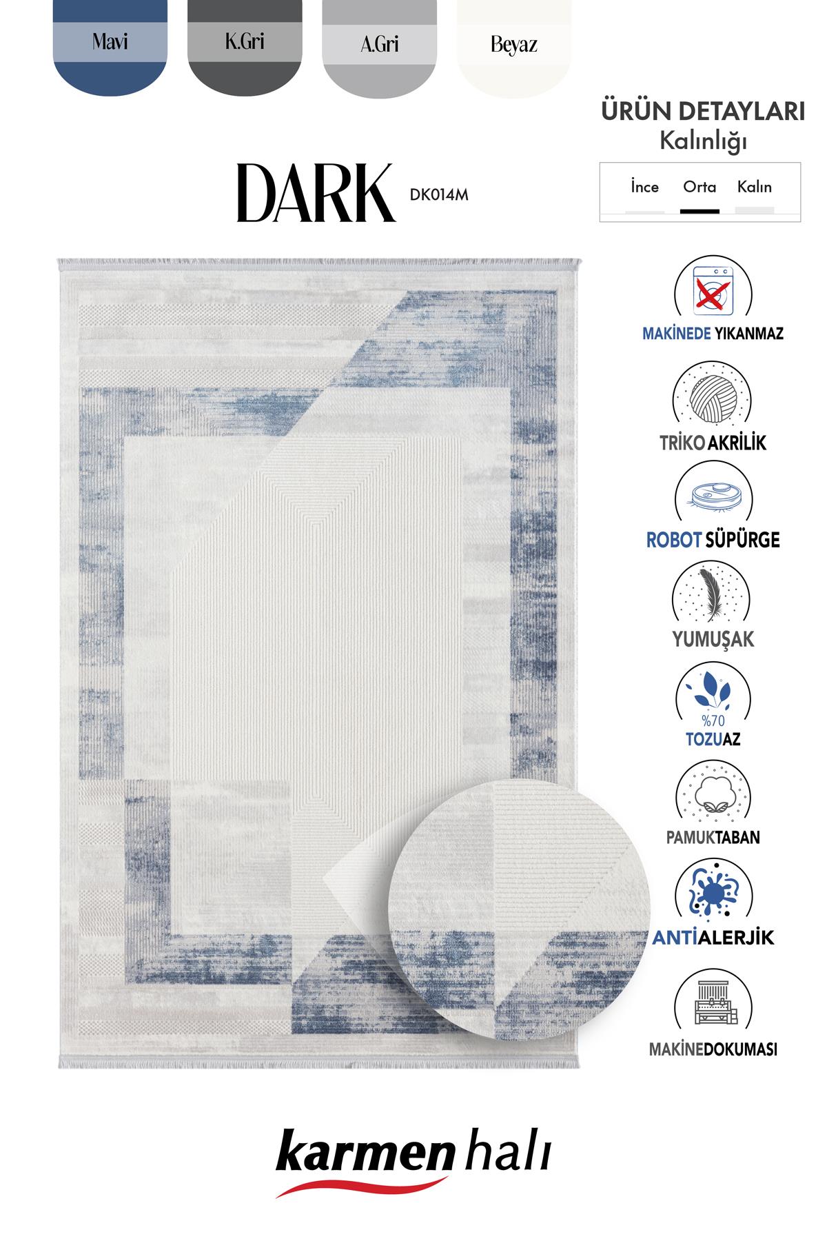 Karmen Halı Dark Dk014m, zarif mavi geometrik detayları ve modern görünümü ile her eve uyum sağlar. Toz yapmayan özelliği ve kaymaz tabanı ile hem estetik hem de pratik bir kullanım sunar.
