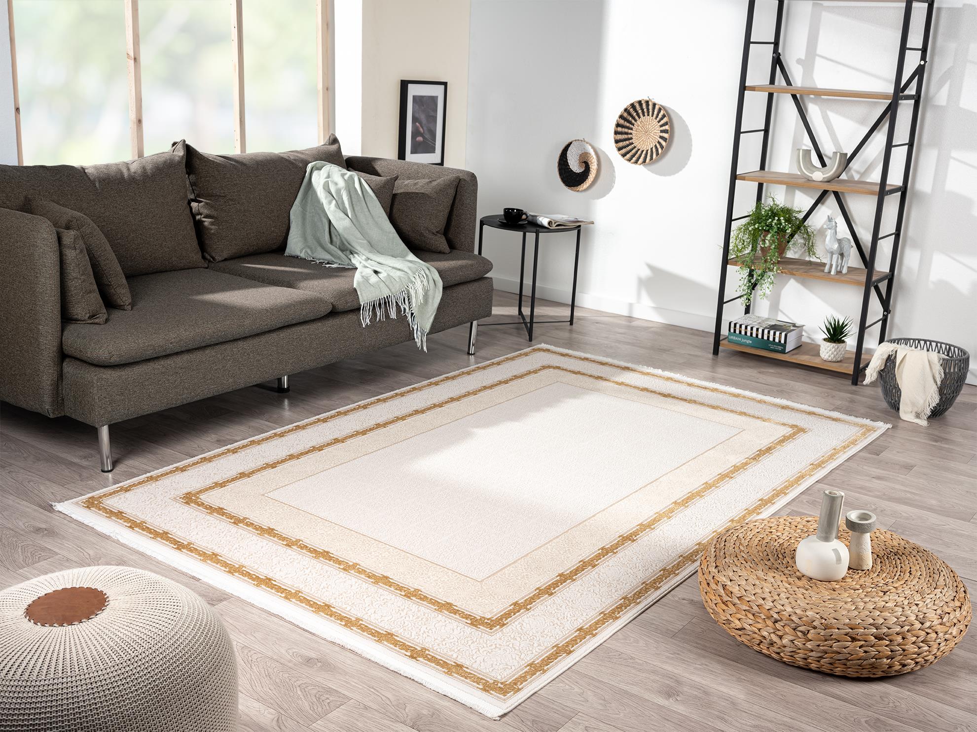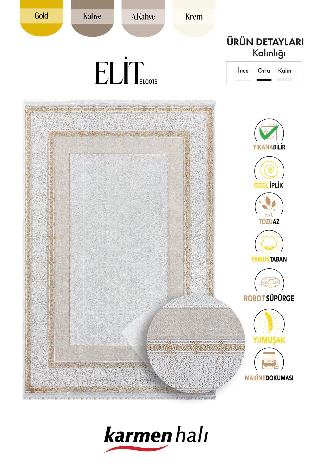 Karmen Halı Elit El001s Krem Halı Gold Kenar Çerçeveli İnce Yumuşak Akrilik Tozuaz Modern Salon Halısı Koridor